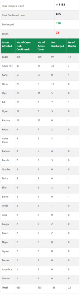 “Till date, 665 cases have been confirmed, 188 cases have been discharged and 22 deaths have been recorded in Nigeria,” the NCDC published on its website.