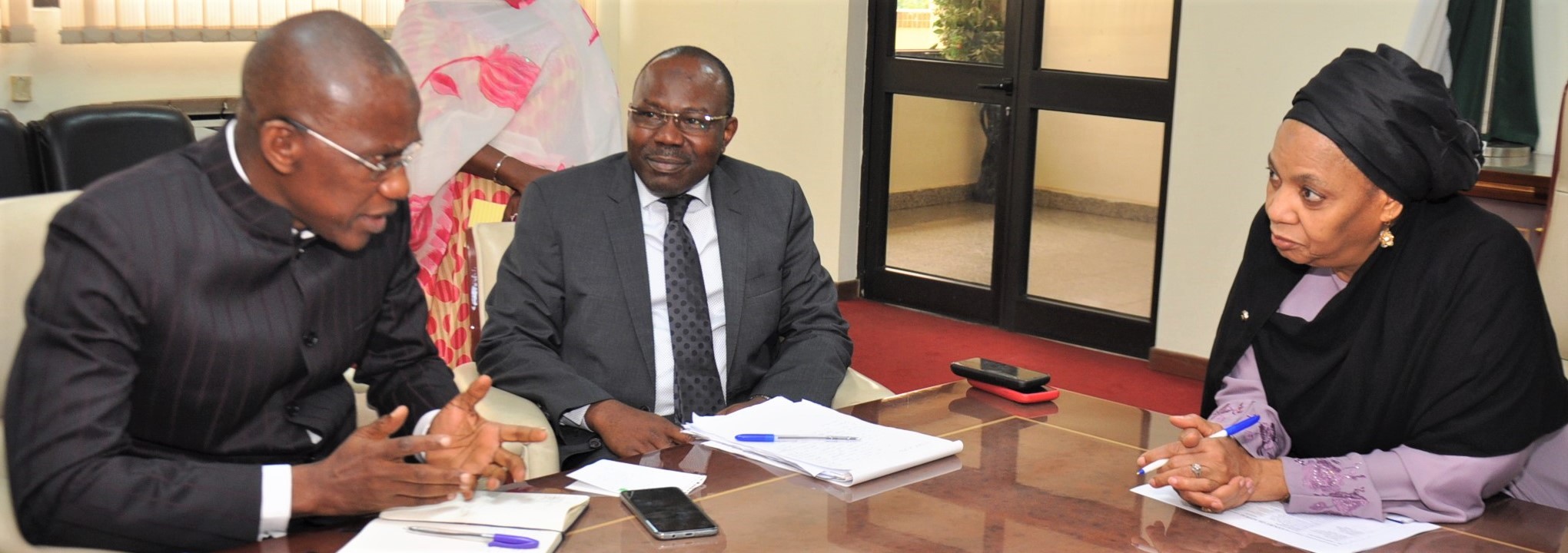 The top echelon of the Asset Management Corporation of Nigeria (AMCON) led by its Chairman, Dr. Muiz Banire, recently paid a courtesy call on the President of the Appeal Court, Honourable Justice Zainab Adamu Bulkachuwa, at her office in Abuja. Picture shows the Managing Director/Chief Executive Officer, AMCON, Mr. Ahmed Lawan Kuru (left), explaining a point to Justice Zainab Bulkachuwa (right) while the Chairman, Board of Directors, AMCON, Dr. Muiz Banire, SAN (middle) listens.