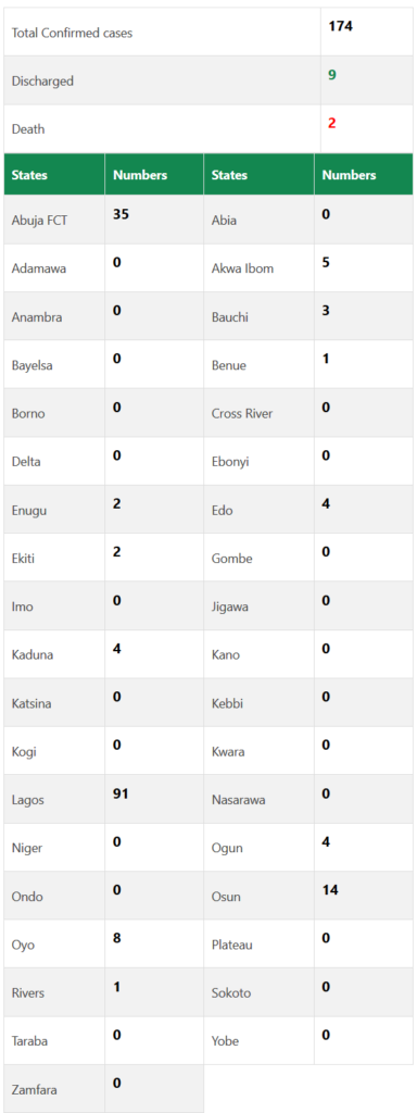 The total confirmed cases of Covid-19 across the federation therefore stands at 174.