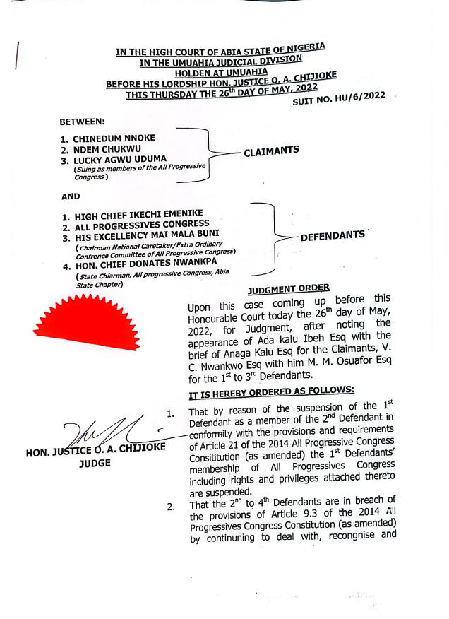The suit, No. HU/6/2022, was brought before the court by Chinedum Nnoke, Ndem Chukwu and Lucky Agwu Uduma, suing as members of the Abia State Chapter of APC, against High Chief Ikechi Emenike, APC, His Excellency Mai Mala Buni (then Caretaker Committee Chairman of APC) and Hon Chief Donnatus Nwankpa, all 1st, 2nd, 3rd and 4th Defendants, respectively.