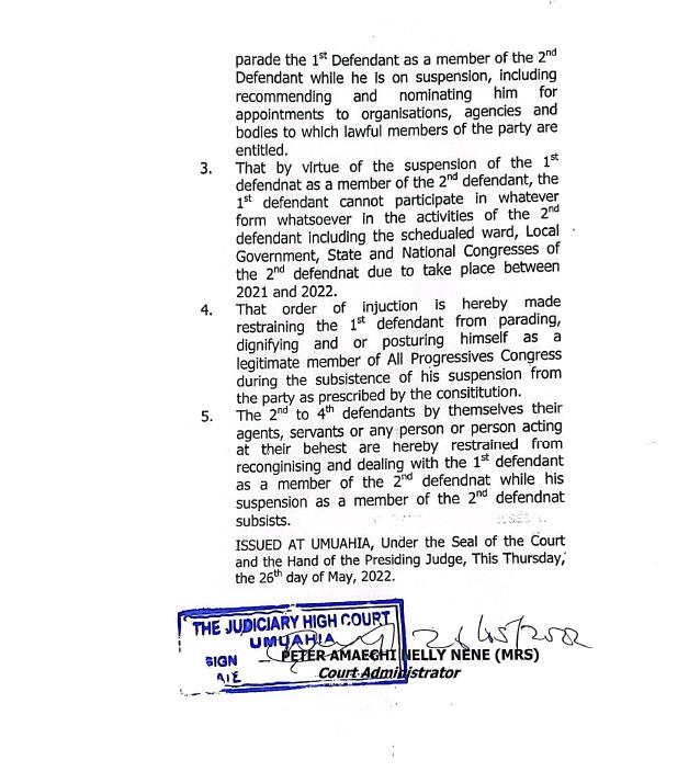 Presiding judge, Hon Justice O.A. Chijioke, in his judgment ordered: “That by reason of the suspension of the 1st Defendant as a member of the 2nd Defendant in conformity with the provisions and requirements of Article 21 of the 2014 All Progressives Congress Constitution (as amended) the 1st Defendant’s membership of All Progressives Congress including rights and privileges attached thereto are suspended.”
