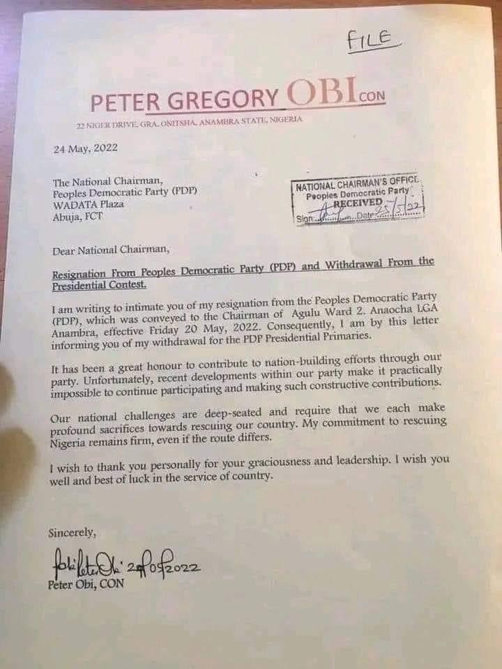 Former Anambra State governor and a presidential aspirant on the platform of the Peoples Democratic Party (PDP), Mr. Peter Obi, has resigned from the party.
