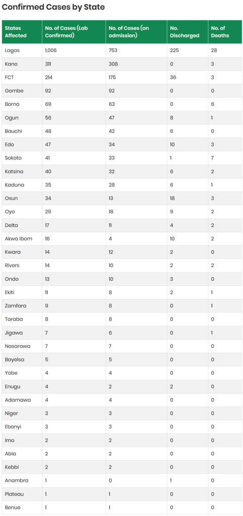 The 238 new cases are reported from the following: Kano (92), FCT (36), Lagos (30), Gombe (16), Bauchi (10), Delta (8), Oyo (6), Zamfara (5), Sokoto (5), Ondo (4), Nasarawa (4), Kwara (3), Edo (3), Ekiti (3), Borno (3), Yobe (3), Adamawa (2), Niger (1), Imo (1), Ebonyi (1), Rivers (1) and Enugu (1).