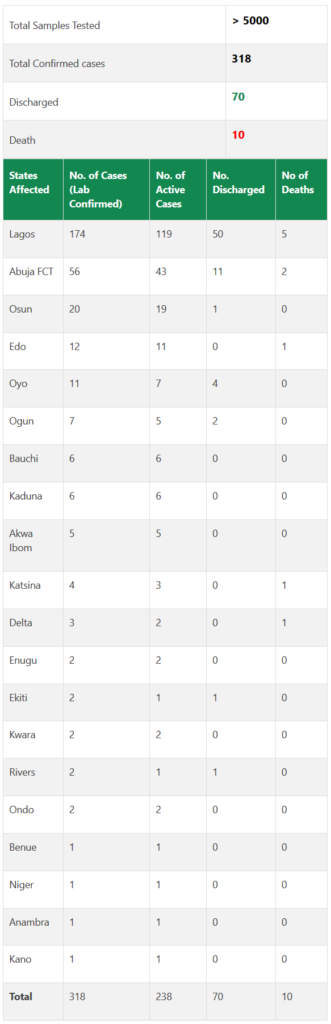 COVID-19: Nigeria has 318 confirmed cases, 13 new, 10 deaths
