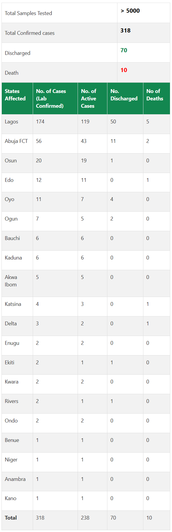 - Till date, 318 cases have been confirmed, 70 cases have been discharged and 10 deaths have been recorded, according to the Nigerian Centre for Disease Control (NCDC).