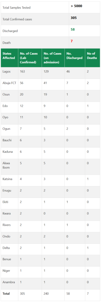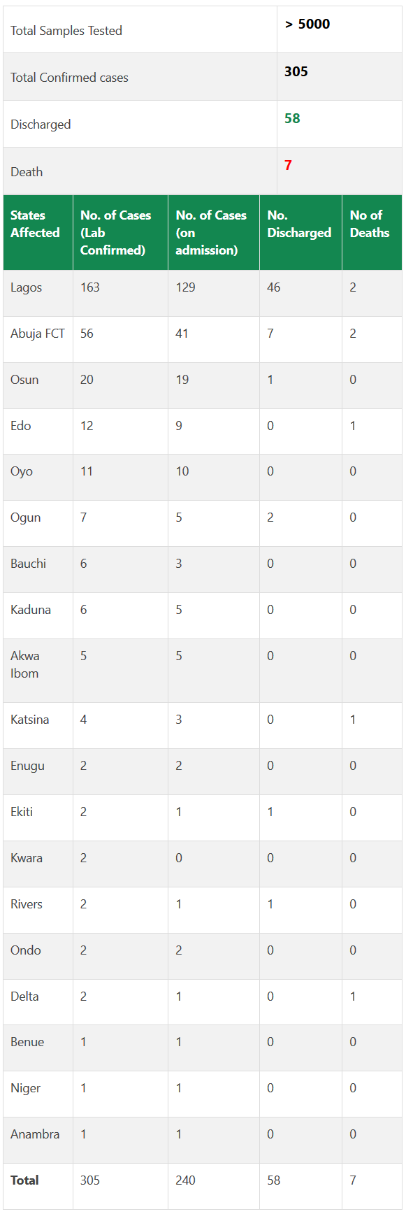 COVID-19: Nigeria hits 305 as 17 new cases are confirmed
