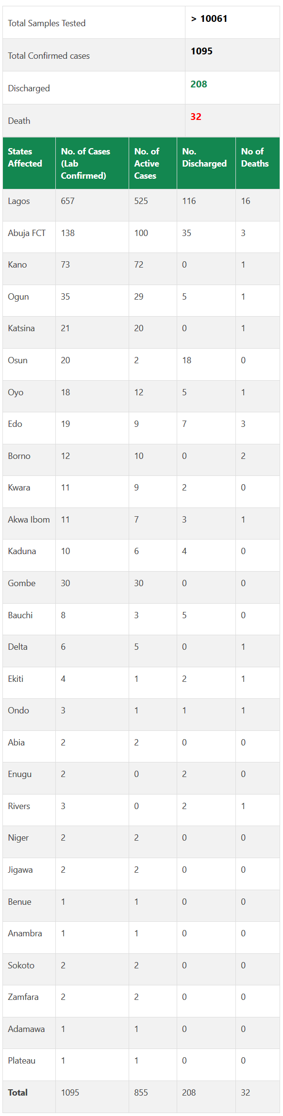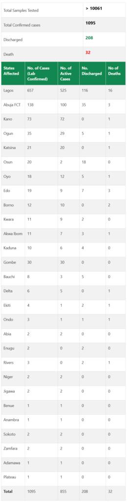 Till date, 1,095 cases have been confirmed, 208 cases have been discharged and 32 deaths have been recorded in 27 states and the Federal Capital Territory, the NCDC announced.