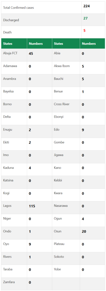 - Till date, 224 cases have been confirmed, 27 cases have been discharged and five (5) deaths have been recorded