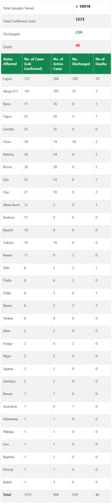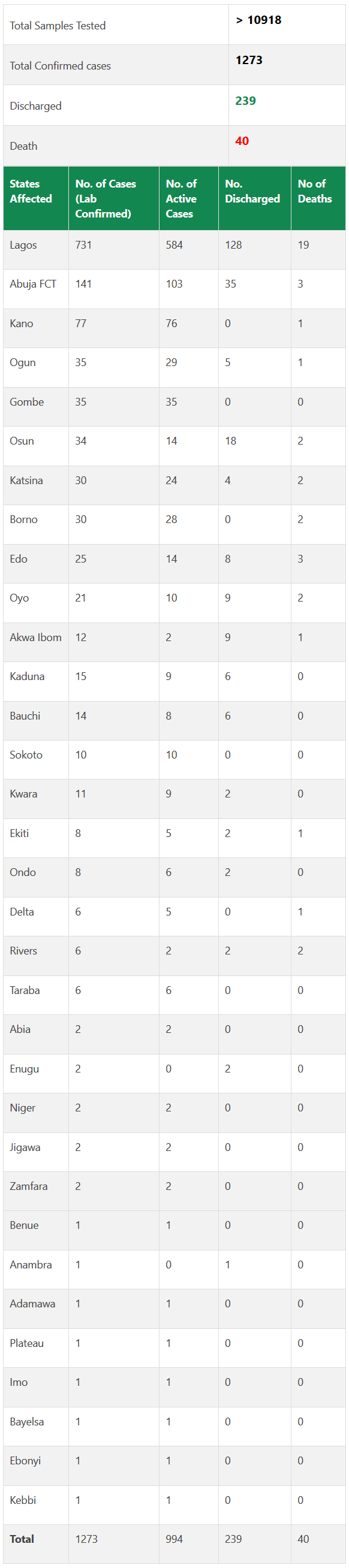 Till date, 1,273 cases have been confirmed, 239 cases have been discharged and 40 deaths have been recorded in 32 states and the FCT.
