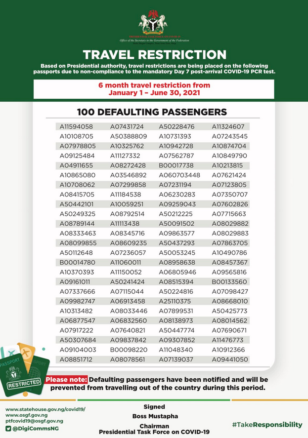 Mustapha, in the statement published on the Twitter handle of the Ministry of Information and Culture and retweeted by the Nigerian Government official Twitter account, @NigeriaGov, said: “Based on Presidential authority, travel restrictions are being placed on the following passports due to non-compliance to the mandatory Day 7 post-arrival #COVID19 PCR test.”