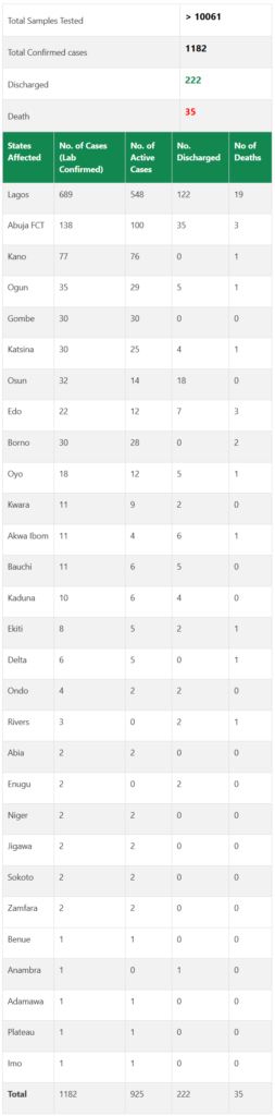 Till date, 1182 cases have been confirmed, 222 cases have been discharged and 35 deaths have been recorded in 28 states and the Federal Capital Territory.
