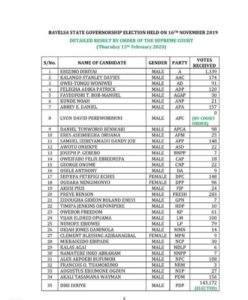 - I welcome you all to this briefing. As you are aware, the Supreme Court of Nigeria yesterday delivered a judgment in a pre-election suit on the Bayelsa State Governorship election held on 16th November 2019. The Commission has received the Certified True Copy (CTC) of the judgment of the apex court which disqualified the Deputy Governorship candidate and vitiated the joint ticket of the party earlier declared winner in the election. The Court also ordered the Commission to “…declare as the winner of the Governorship election in Bayelsa State the candidate with the highest number of lawful votes cast with the requisite constitutional (or geographical spread)”.