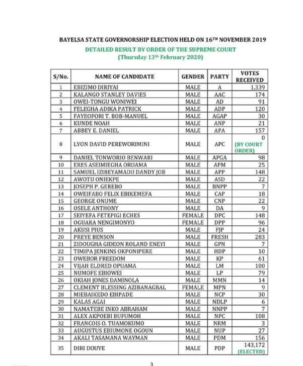 - Consequently, Senator Douye Diri AND Senator Lawrence Ewhrudjakpo of the PDP are hereby declared winners and returned elected as Governor and Deputy Governor of Bayelsa State respectively.