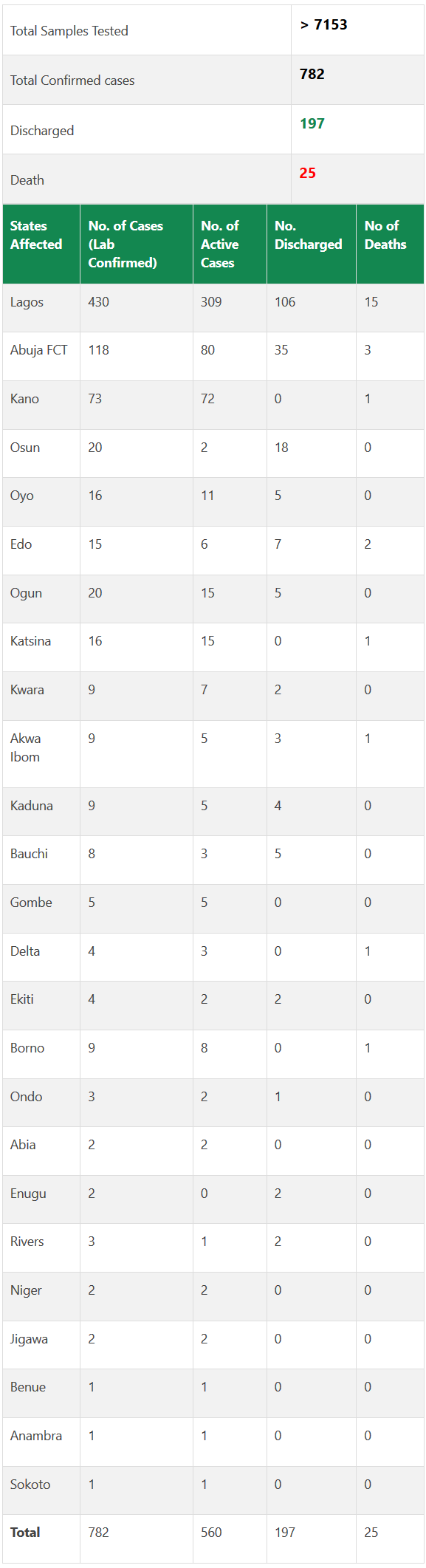 Till date, 782 cases have been confirmed, 197 cases have been discharged and 25 deaths have been recorded in Nigeria, the NCDC said.