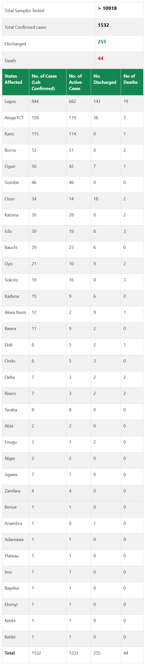 Till date, according to the NCDC, a total of 1,532 cases have been confirmed, 255 cases have been discharged and 44 deaths recorded in 33 states and the Federal Capital Territory (FTC), Abuja.
