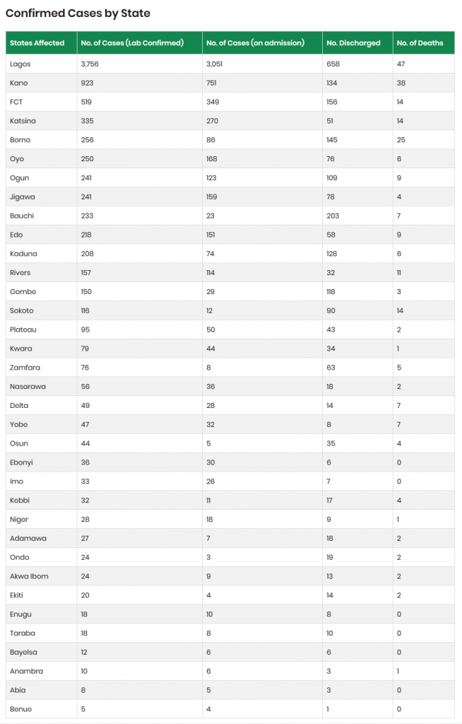Lagos State remains the epicentre of the battle against the coronavirus pandemic in Nigeria. Out of the 276 new cases, Lagos hauled in a total of 161. Rivers State returned 36, Edo (27), Kaduna (19), Nasarawa (10), Oyo (6), Kano (4), Delta (3), Ebonyi (3), Gombe (2), Ogun (1), Ondo (1), Borno (1), Abia (1) and Bauchi (1).
