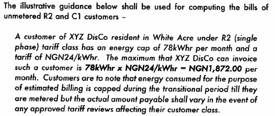 “The energy cap prescribed by the Commission shall only apply to R2 and C1 customers. All other customers on higher tariff charges must be metered by DisCos no later than 30 April 2020, failing which these customers are not liable to pay any estimated bill issued by the DisCo.