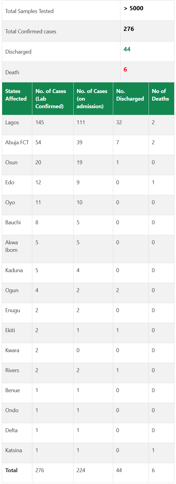 - Till date, 276 cases have been confirmed, 44 cases have been discharged and six (6) deaths have been recorded.