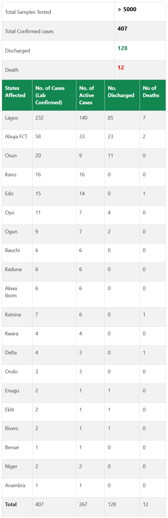 Till date, 407 cases have been confirmed, 128 cases have been discharged and twelve deaths have been recorded.