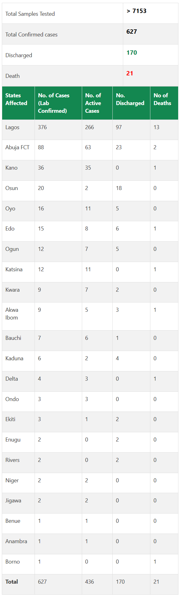 Till date, 627 cases have been confirmed, 170 cases have been discharged and 21 deaths have been recorded in Nigeria, the NCDC announced.