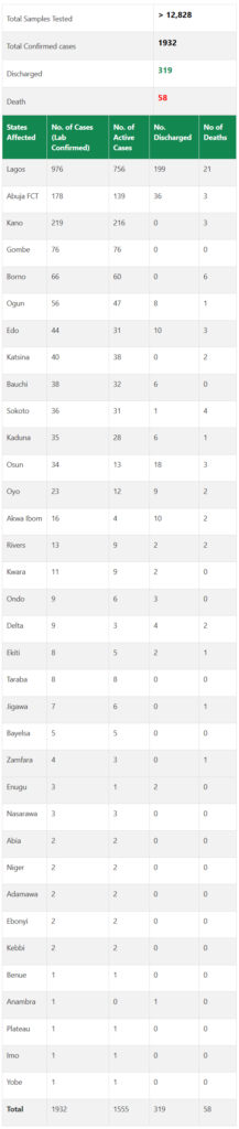 According to the NCDC, 1,932 cases have been confirmed, 319 cases discharged and 58 deaths have been recorded in 34 states and the Federal Capital Territory (FCT), Abuja.