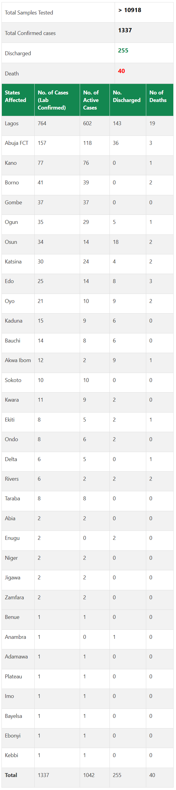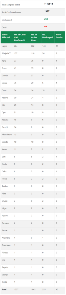 Till date, 1,337 cases have been confirmed, 255 cases have been discharged and 40 deaths have been recorded in 32 states and the Federal Capital Territory.