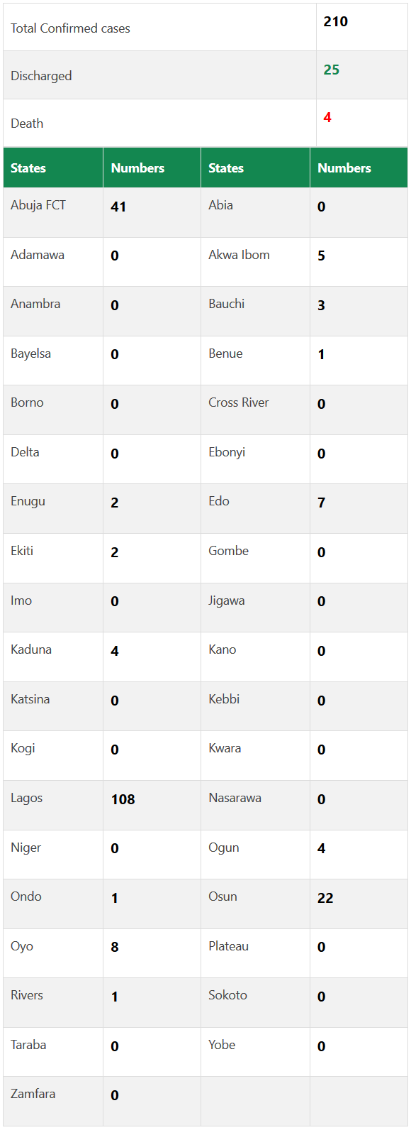 Consequently, as at 10.30pm of Saturday, April 3 2020, Nigeria has recorded in total four (4) deaths, 25 discharged cases and 210 confirmed cases.