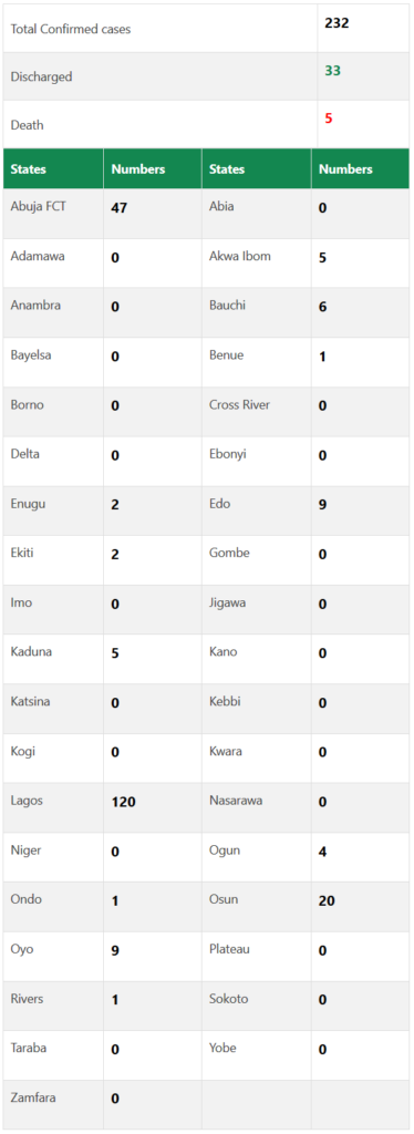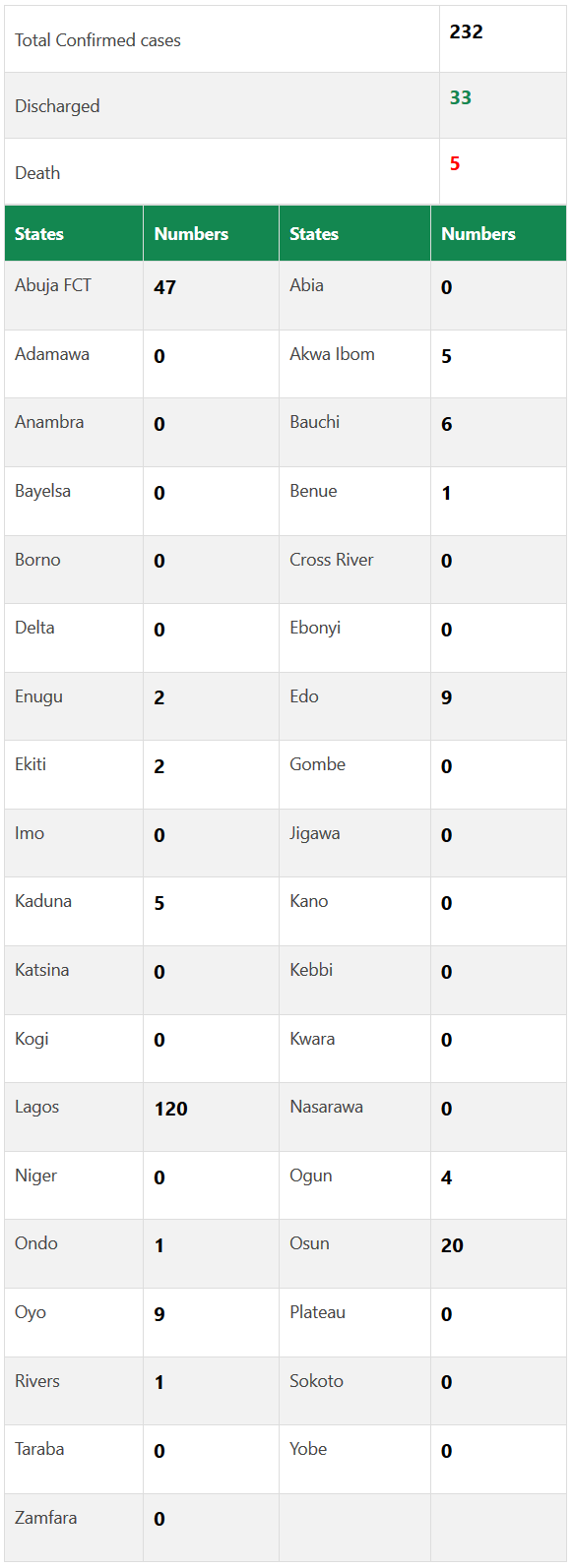 - Till date, 232 cases have been confirmed, 33 cases have been discharged and five (5) deaths have been recorded in Nigeria.