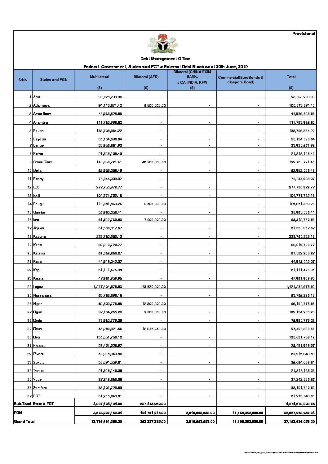 BusinessSee how much Abia, Lagos, Kano other states are owing in foreign and local debts Published 6 years agoon 24/10/2019By Kazie Uko Facebook Comments Related Topics: Up Next$135,000 IAAF missing money: Sports Minister, Dare, clears Dalung’s mess Don't MissDMO says Federal Government Bond oversubscribed by 71% at October auction Advertisement You may like Comments