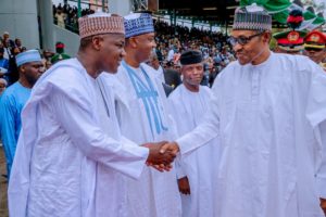 - President Buhari in hand shake with the Speaker House of Reps, Yakubu Dogara