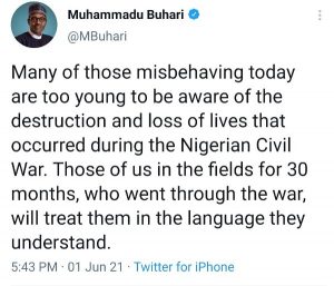 The President had tweeted: “Many of those misbehaving today are too young to be aware of the destruction and loss of lives that occurred during the Nigerian Civil War. Those of us in the fields for 30 months, who went through the war, will treat them in the language they understand.”